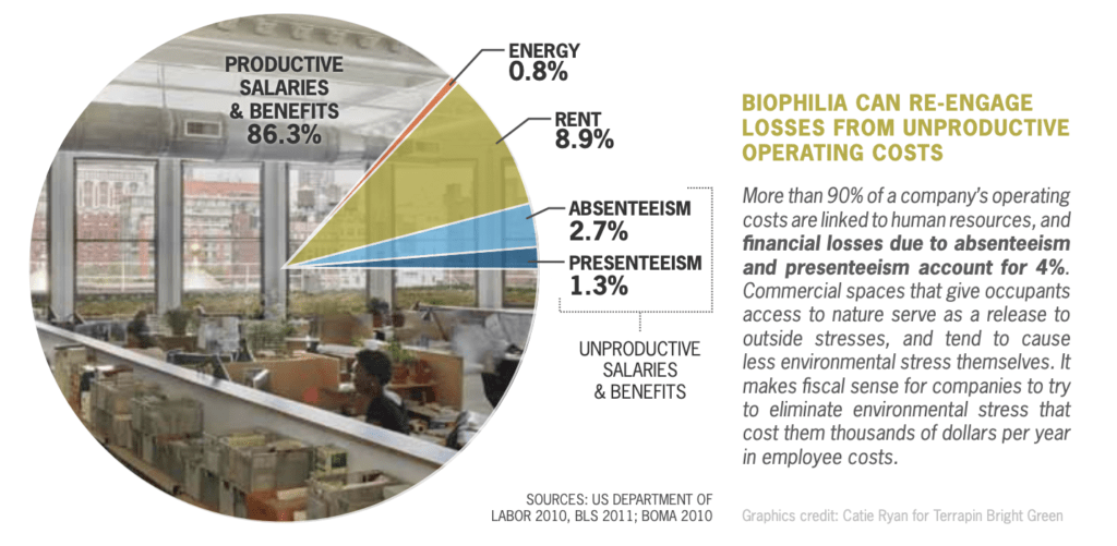 By simply “providing employees access to plants, natural views, daylight, and other biophilic design elements” employers are poised to save over $2,600 per employee per year in absenteeism, and over $1,100 in presenteeism (3).